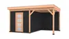 Combinatie 2 bestaat uit de overkapping met een enkelzijdige achterwand. De wand bestaat uit douglas zweeds rabat planken van 195 mm, regelwerk en bevestigingsmateriaal.