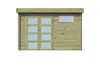 Dit prachtig modern tuinhuis heeft wanden van 44 mm dik massief vurenhout (onbehandeld) - afkomstig van het hoge Noorden - en een staaldak met anti-condensdoek. De afwerking van de uiteinden van de planken is recht, wat een strakke en vooral moderne uitstraling geeft.